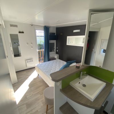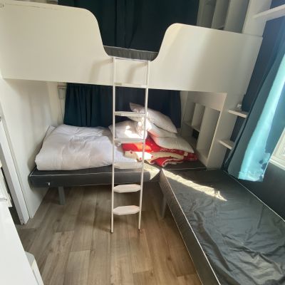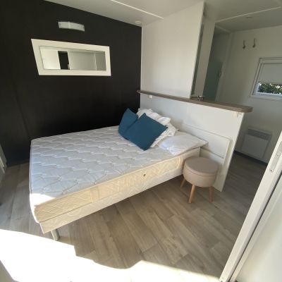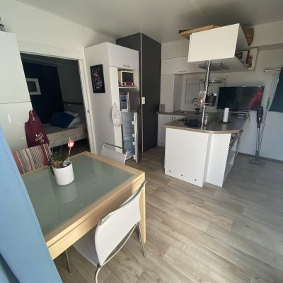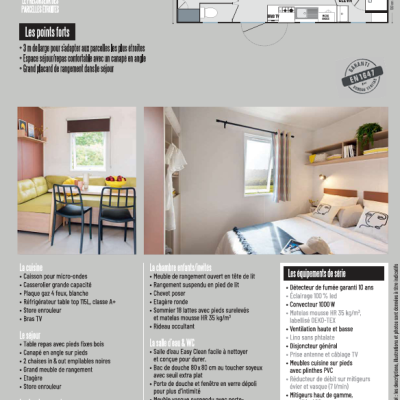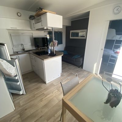 Descriptifs : Salon avec télévision et décodeur, cuisine équipée micro-onde, plaque et hotte, réfrigérateur. Chambre 1 lit double 140x190 avec penderie, 2 lits simples 60x180 avec penderie, salle de douche avec lavabo et WC.